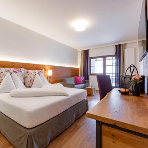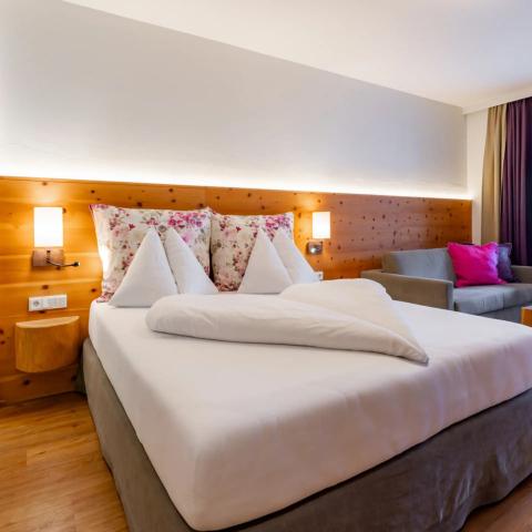 Juniorsvit med dubbelsäng och extrabäddar, bad/dusch, WC och balkong.